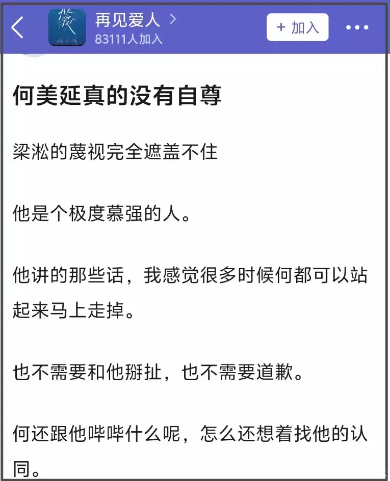 更重要的是,大家都看出来了,都不用谈双方爱不爱什么的,何美延最大的问题就是没有自尊,只是全程都被美化成了寻找自我价值。