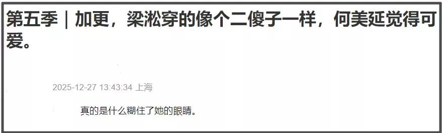 然而在何美延看来,快40岁的梁淞穿了个背带裤把自己整成小学生的模样很可爱,还大力夸赞梁淞穿搭品味。
