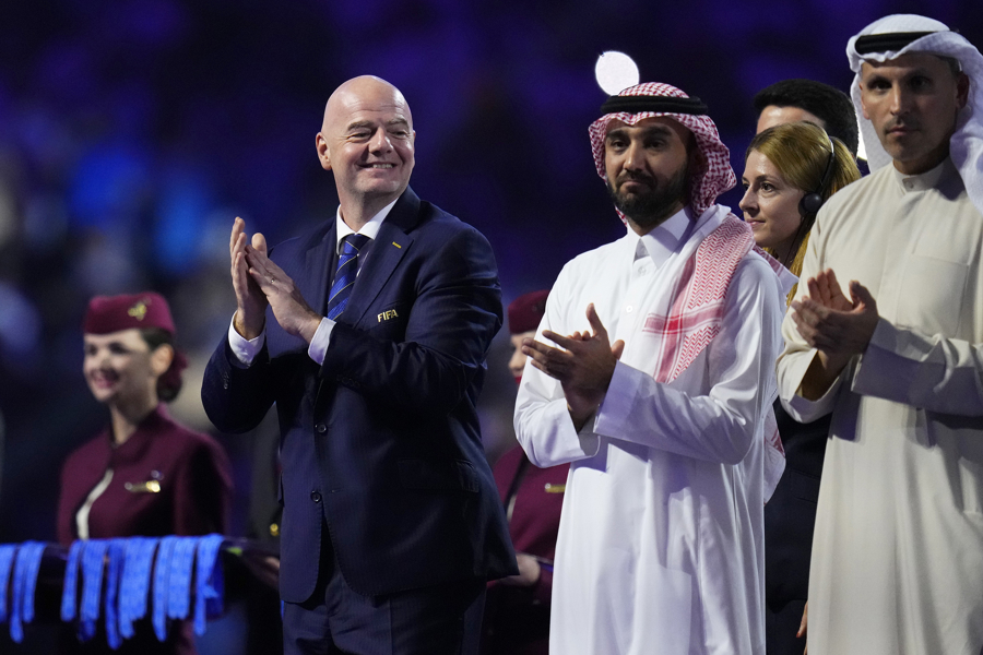 2023年世俱杯在沙特阿拉伯吉达举行,国际足联主席因凡蒂诺(左)出席颁奖典礼