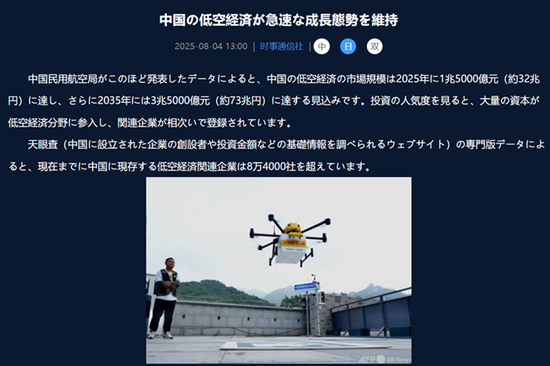 甚至就连日本时事通信社都发文称:“中国低空经济呈现强劲增长,2025年市场规模预估达1.5万亿元,2035年增至3.5万亿元;低空经济相关企业中国超过8.4万家,无人机广泛应用于物流、应急救援等领域,带动新型职业发展。”