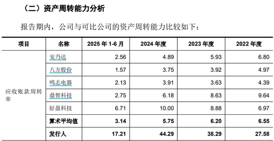 其次体现在不“卷”回款,也即不以牺牲销售收款效率来换取客户订单。数据显示,截至今年上半年末,三瑞智能的应收账款净值约为2700万元,这仅相当于上半年销售收入金额的6%左右。招股书还披露,该公司的应收账款周转率,不仅远超同行业可比公司的平均值,而且是同行业其他所有公司都远远无法企及的回款效率。